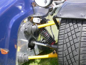 Front suspension is similar to the mark 2, except that the top wishbone now mounts into a formed channel part of the monocoque chassis, the grease nipple mod still applies, but the channel where the pivot bar mounts, is a weak spot, and after a while the holes will wear or even cracks can appear, suitable strengthening is required. The cockpit on the Mk3 has gone slightly narrower than the Exmo, but not as narrow as the earlier cars. The rear suspension is the sierra components, now hung onto RH coil-over shocks. |